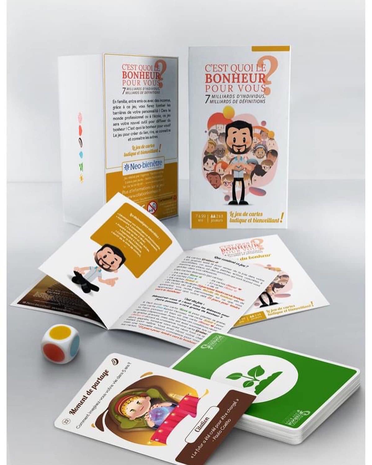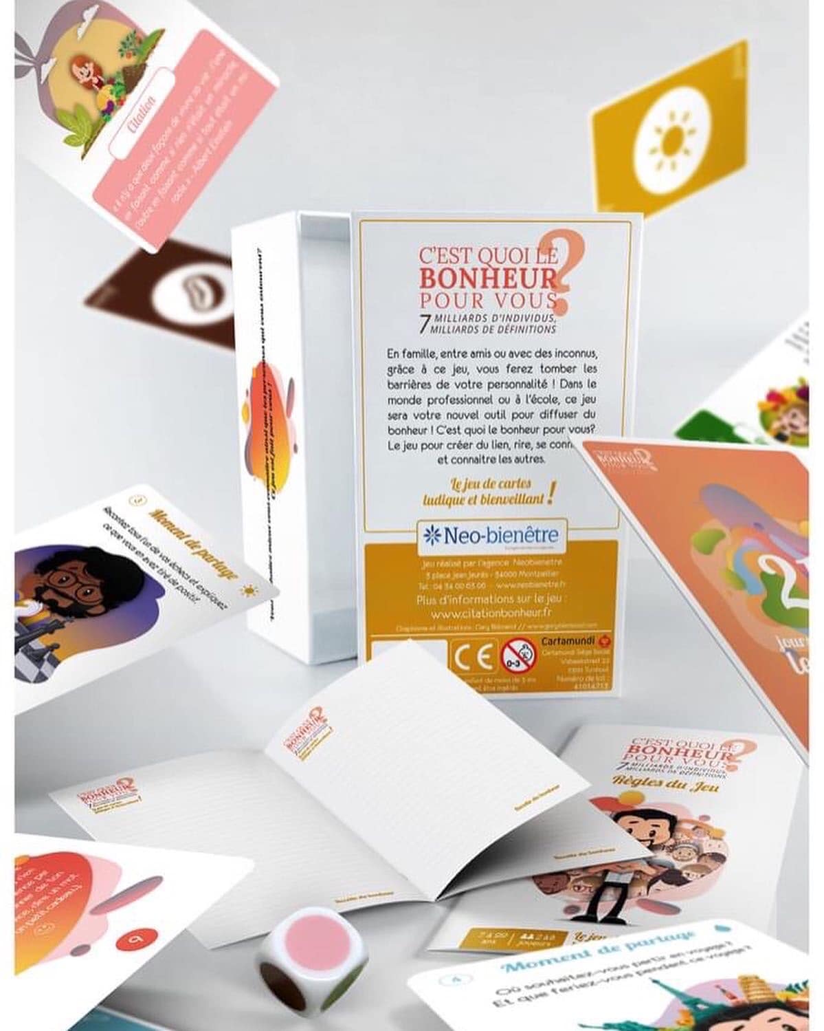 👉Ce jeu est conseillé de 7 à 99 ans et pour 2 à 8 joueurs. Il contient 168 cartes, un dé et un livret « Recette du bonheur » pour prendre des notes.
